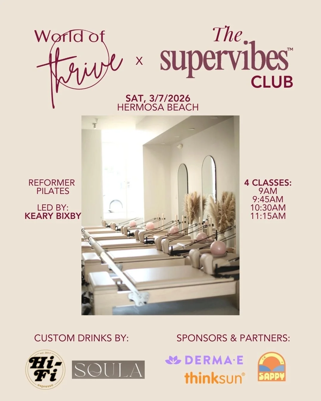 Join @worldofthrive, @supervibesclub, and @hifiespresso for a feel-good morning dedicated to strength, community, and incredible women. Enjoy 30-minute reformer sessions, curated goody bags, and a specialty colostrum latte crafted just for the event at Hifi Espresso.